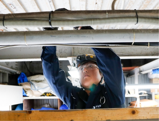 安全を最優先に、徹底した管理体制のもとで業務を遂行。港湾の航路標識など重要設備にも対応する信頼性の高い事業所です。